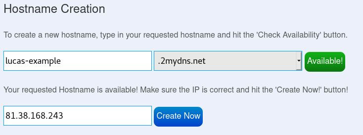 Create your hostname. First, you need to click on Check Availability, next it will ask you for your public IP. Note that NOW-DNS will auto-fill it, however, you easily check your IP here.
